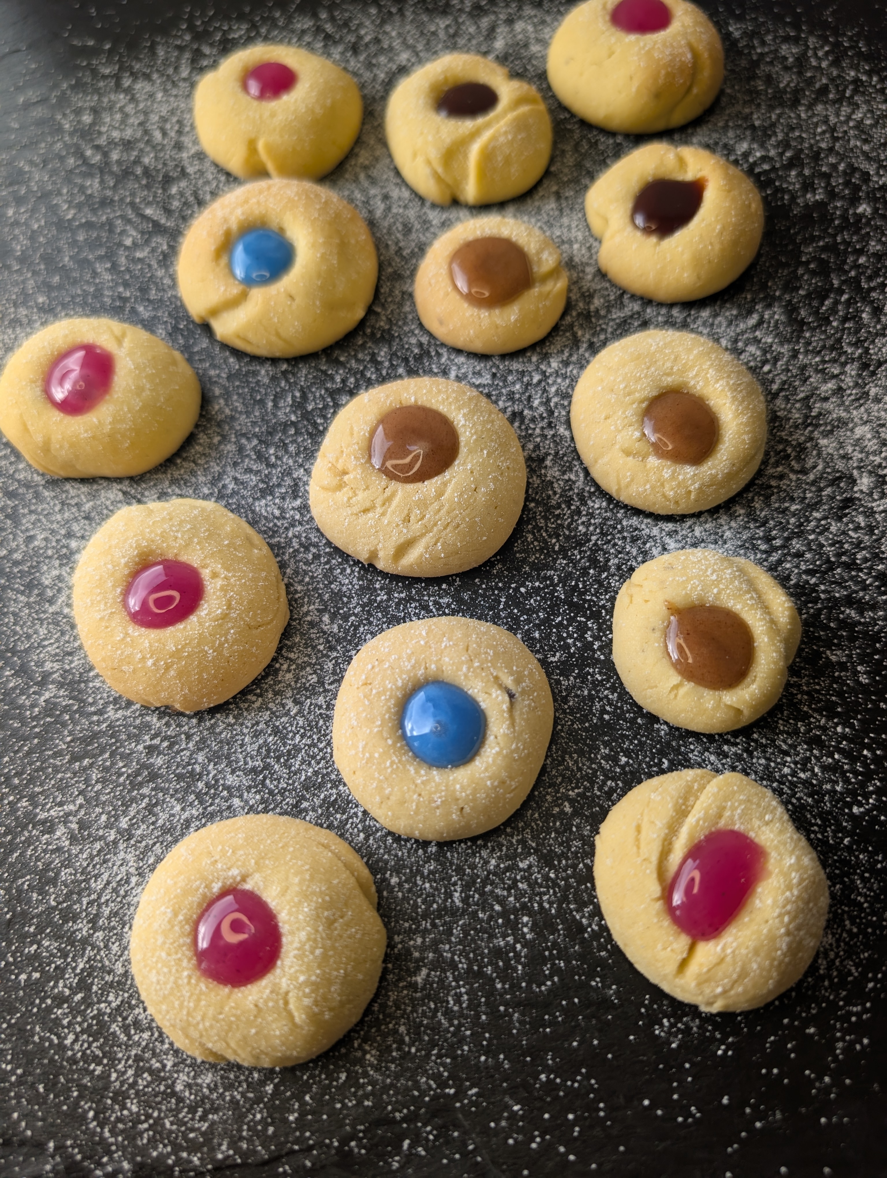 Den Teig in walnussgroße Stücke teilen und zu Kugeln rollen. Auf ein mit Backpapier ausgelegtes Blech legen. In die Mitte der Kugel nun mit dem Stiehl eines runden Holzkochlöffels eine Mulde eindrücken.